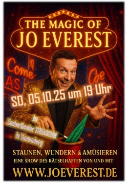 Jo Everest versteht es, sein Publikum zum Staunen und Träumen zu bringen. Freuen Sie sich auf einen Abend voller Magie, Spannung und Fantasie. „Magie der Träume“ ist die perfekte Mischung aus verblüffenden Tricks, humorvollen Momenten und emotionalen Höhepunkten.